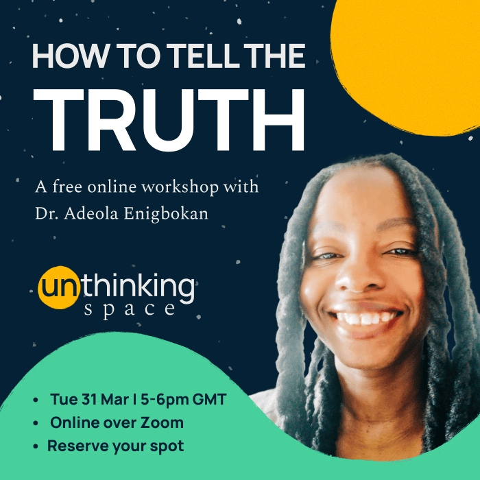 If this resonates, next week inside Unthinking Space, my dear friend Dr. Adeola Enigbokan is running a free workshop on truth-telling. Adeola is a storyteller, cultural worker and coach who helps people shift their narratives of what is possible in their working lives.