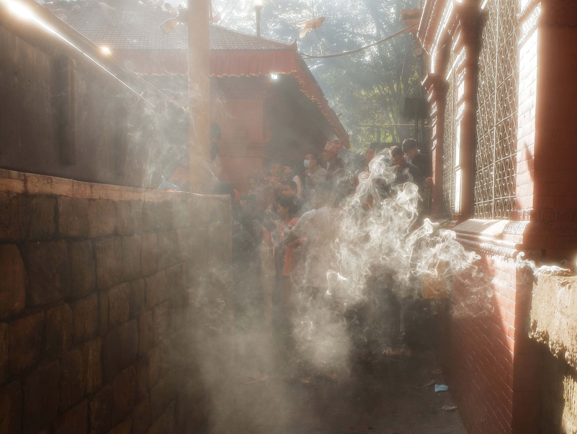 Smoke from incense sticks clouds a temple alleyway in Kathmandu, Nepal, where people line up curiously to watch the rituals. (Photography by Nirish Shakya)